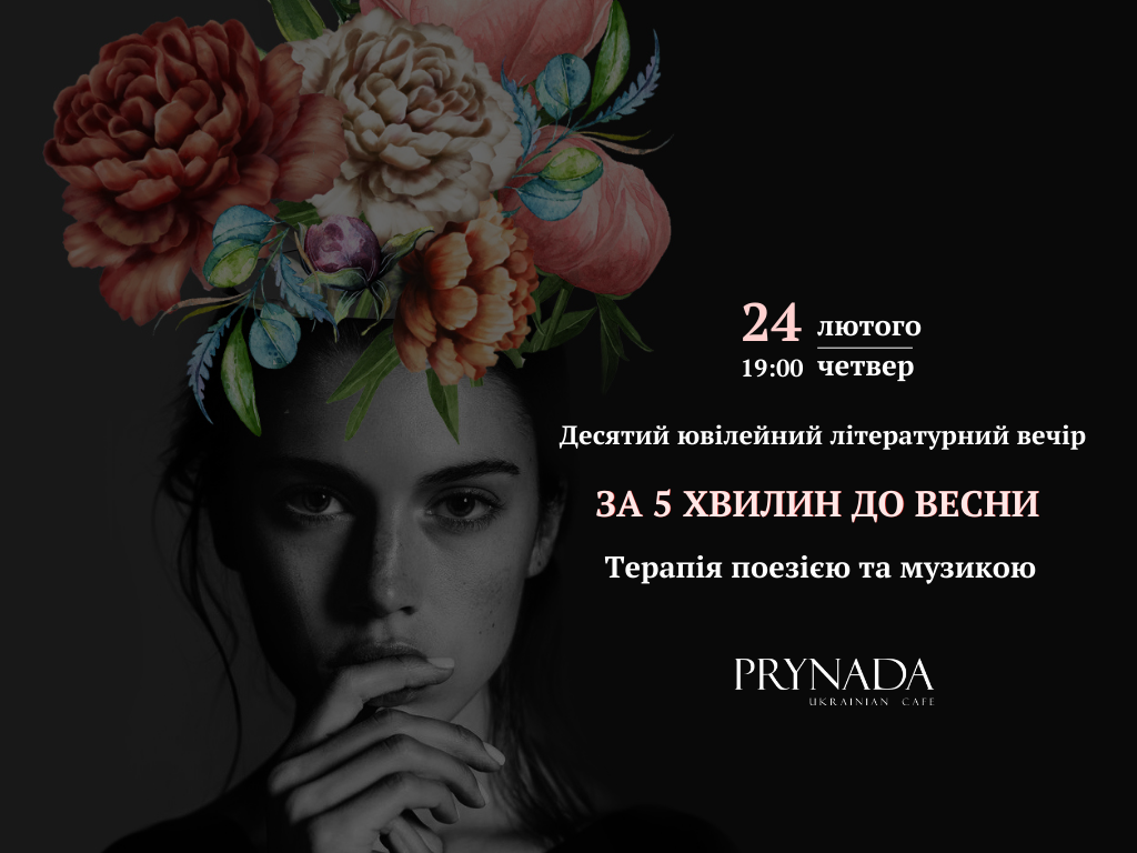 24 лютого в Prynada Gastro Restaurant відбудеться ювілейний Х поетично-музичний вечір під назвою «За 5 хвилин до весни…» – терапія поезією та музикою.